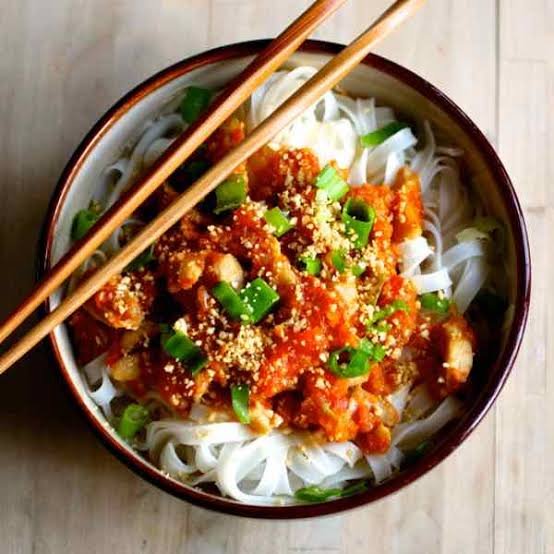 Shan noodles is made of chicken or pork cooked in tomatoes, is served over a bed of rice noodles. It can be served with broth or without it as well. When served with broth, it is often served on the side. Shan noodles are also typically served with pickled mustard greens [monnyinjin], and sometimes with fried chickpea tofu [tohu nway]