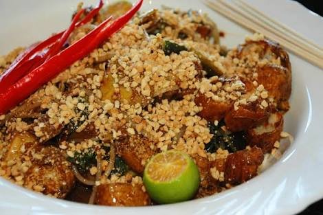 This is the freshest tasting salad – crunchy fruit and vegetables with fried tofu in a sweetly sticky, slightly sour dressing, sprinkled with roasted peanuts. It includes some unusual ingredients, but they can be found at Asian grocers. Yam bean (also called jicama) is a pale brown tuber with crisp white, slightly sweet flesh. Water spinach (called kang kong in Malay but common throughout Asia) is a crunchy, hollow-stemmed green with long pointed leaves. Fried dough sticks are deep-fried strips of unsweetened dough and are also known as Chinese doughnuts or crispy crullers.
