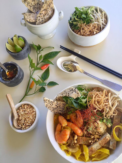 It has a distinguished look, texture, flavor, and it is served with very little broth unlike other kinds of noodle soup. The beautiful wide yellow turmeric noodle – covered with vibrant orange shell-on shrimps, fatty thin slices of pork belly, sesame rice crackers, roasted peanuts, fresh herbs, and shredded banana blossom – is so appetizing.