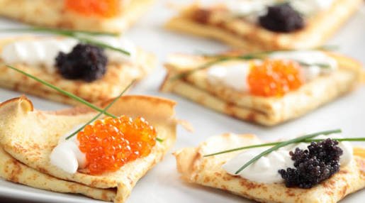 A blini is a Russian pancake traditionally made from wheat or (more rarely) buckwheat flour and served with smetana, tvorog, butter, caviar and other garnishes. Its roots trace back to ancient Slavic rituals. They are also known as blinztes, crepes or palatschinke.