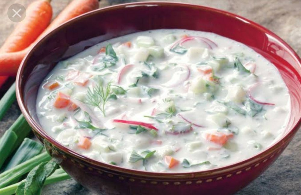 Okroshka is mostly served in summer because the soup combines the refreshing taste of kvass and the lightness of a salad. Salt and sugar can be added according to taste.